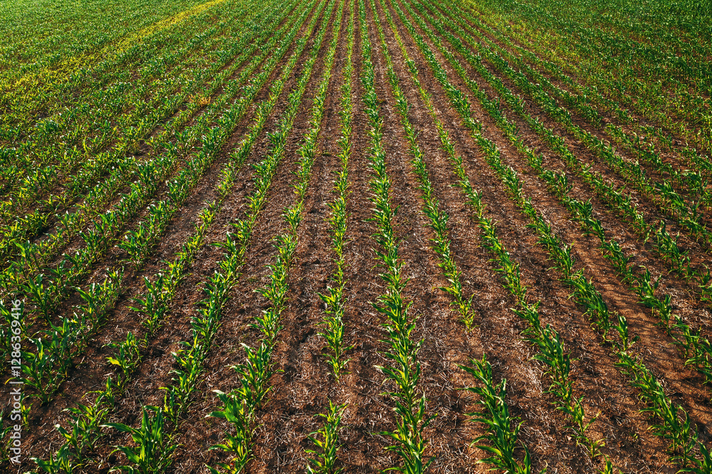 Aerial shot of cultivated corn crop field in diminishing perspective
