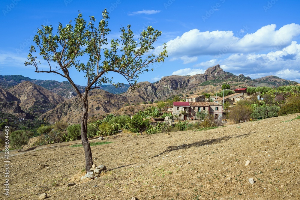 Olive groves and mountains around Ghost Town, Pentedattilo Village, Calabria, Italy, Europe
