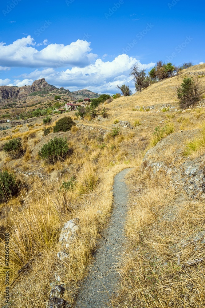 Olive groves and mountains around Ghost Town, Pentedattilo Village, Calabria, Italy, Europe