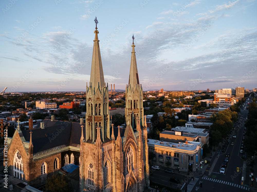 Drone flight above the Roman Catholic Saint-Edouard Church in Montreal at sunset, Quebec, Canada