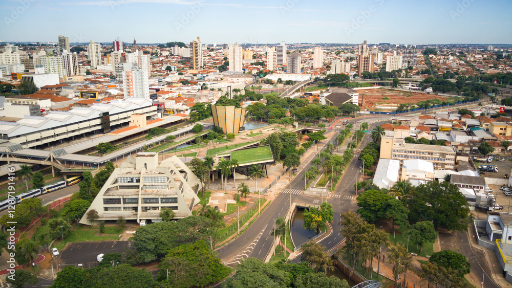 Aerial View of Downtown São José do Rio Preto, Brazil – Municipal Library, Bus Terminal, and Rio Preto River