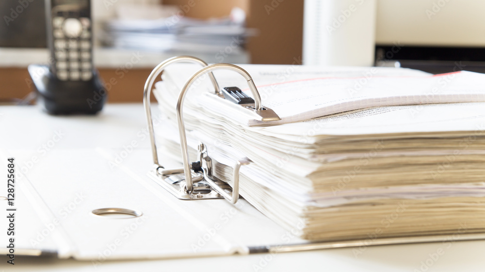 Aktenordner mit Steuerunterlagen für Finanzamt auf Schreibtisch mit Telefon und Drucker im Hintergrund