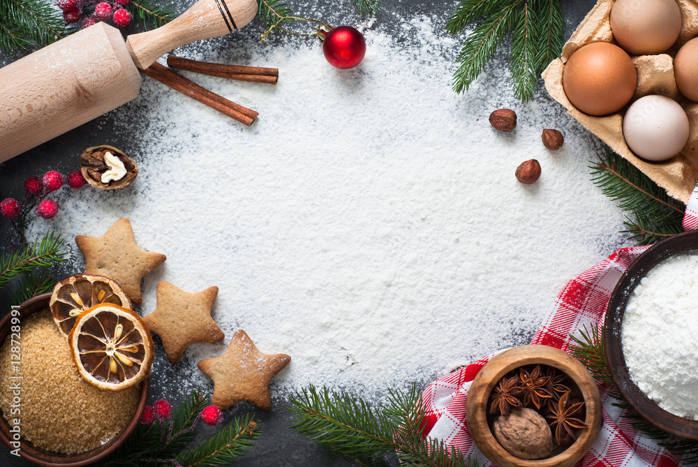 Ingredients for cooking Christmas baking. Christmas food background