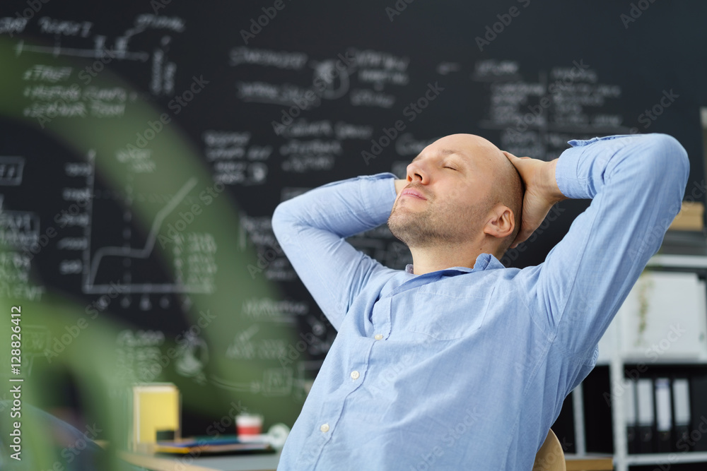 mann im büro lehnt sich zurück mit geschlossenen augen
