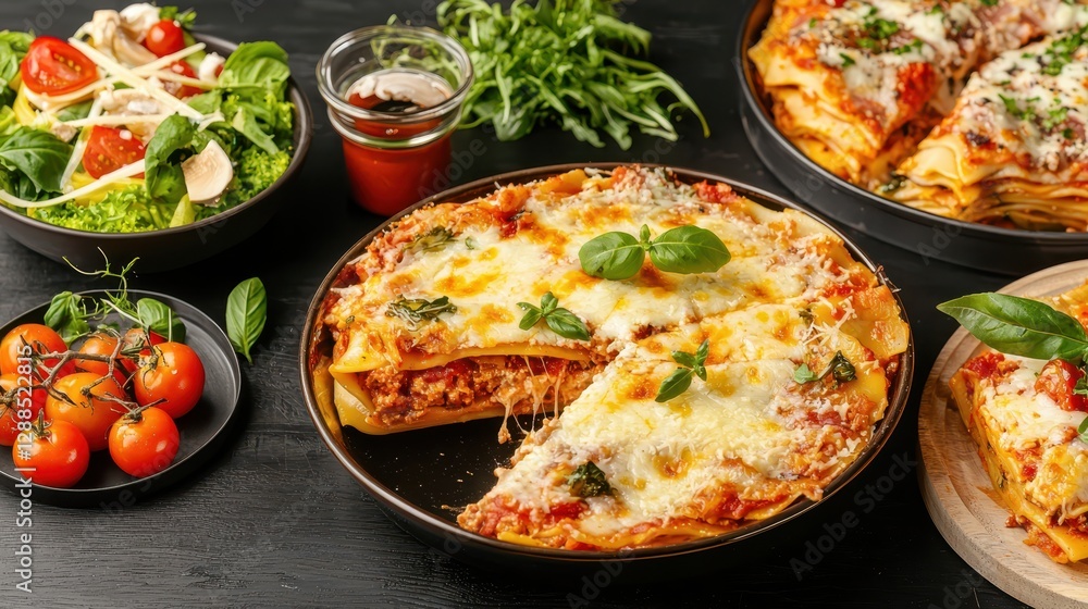 Meat lasagna layered melting concept. A delicious spread featuring lasagna, fresh salad, cherry tomatoes, and herbs, all beautifully arranged on a dark wooden table.