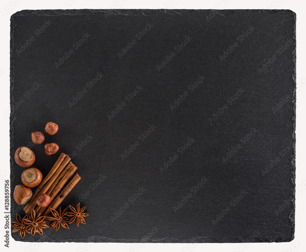 Cinnamon, hazelnutand star anise on a black slate board. Isolate