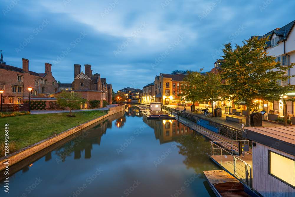 Cambridge city downtown with river Cam at sunrise. England