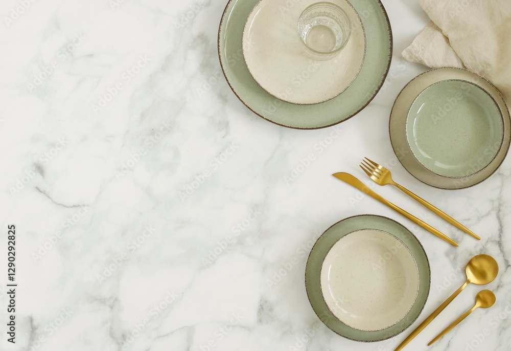 Modern minimal table place setting neutral color s on marble background top view with copy space. Modern kitchen.Scandinavian style tableware.Business food brand template.