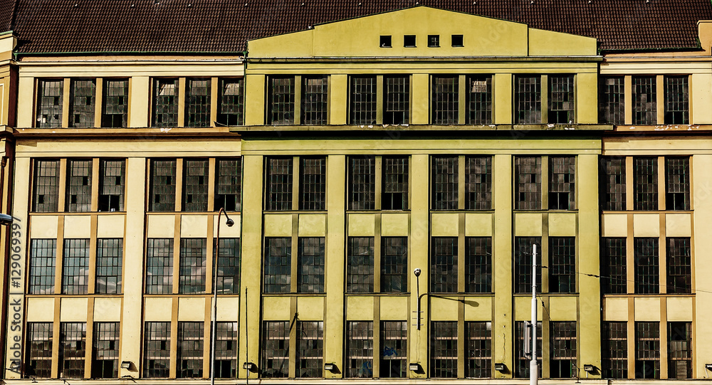 Beautiful facade of a desolate old textile factory from the 1920`s. Brno, Czech republic.