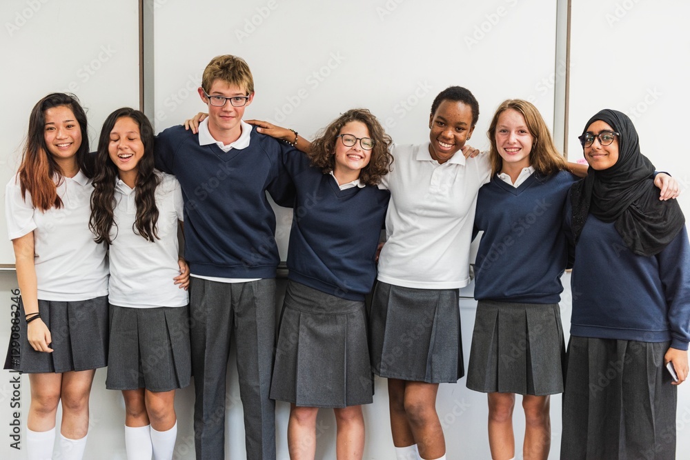 Group of diverse students in school uniforms, smiling and standing together. School uniforms, diverse group, smiling students, happy teens, unity in diversity. Diverse international school students.