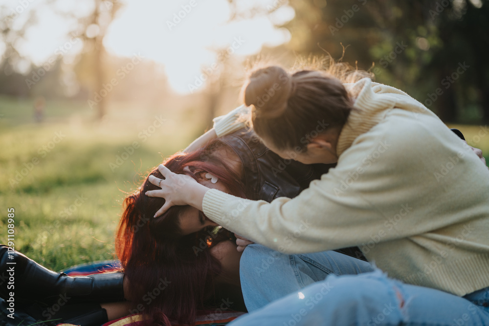 Two friends are seen joyfully wrestling in a serene green park during sunset. The image captures a moment of energy and playfulness under golden sunlight, personifying friendship and lively bonding