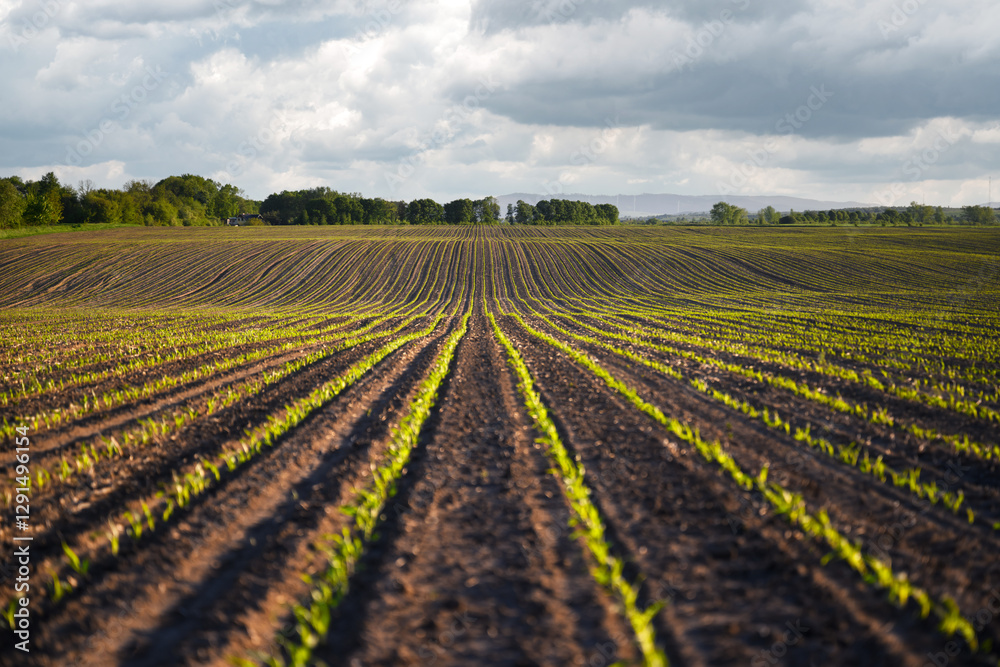 Wavy rows of young green corn plants in vast agricultural fields. Farming background
