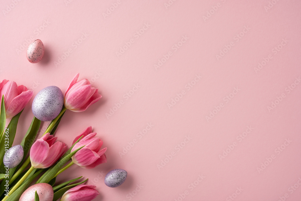 Pink tulips and speckled Easter eggs creatively arranged on a soft pink background