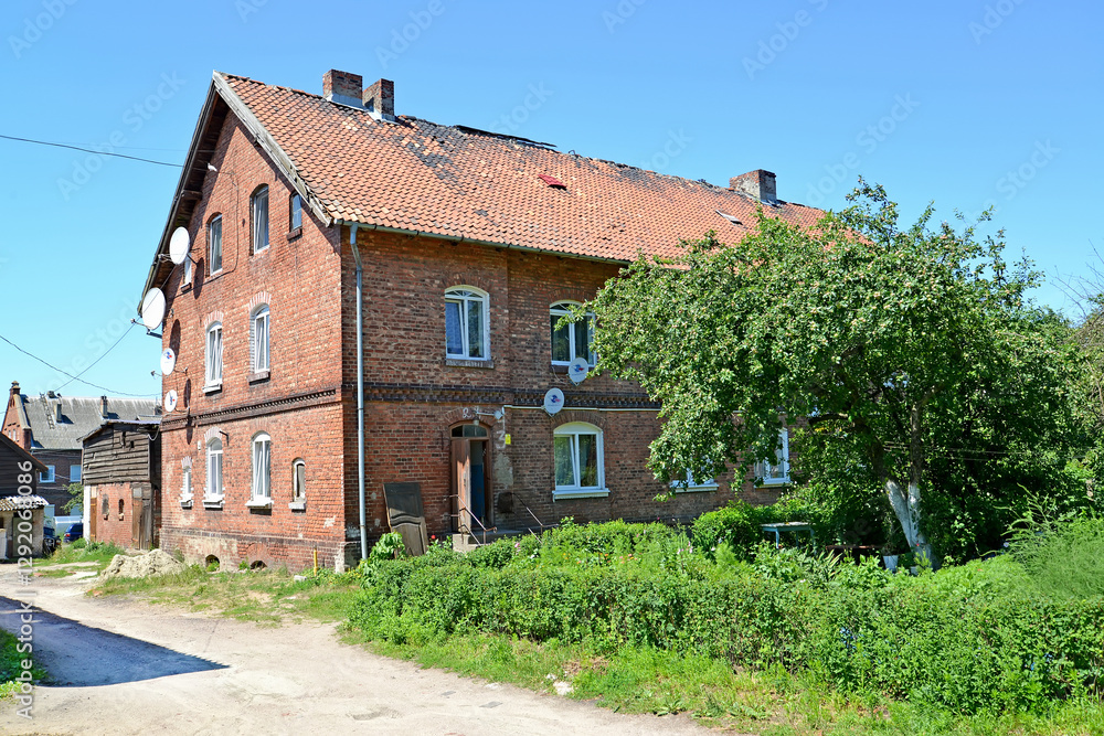 KALININGRAD REGION, RUSSIA - JUNE 27, 2016: Old brick residential building, pre-war building. Yantarny settlement