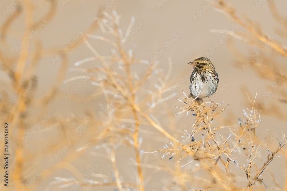 Savannah Sparrow Passerculus sandwichensis in morning light with room for a title