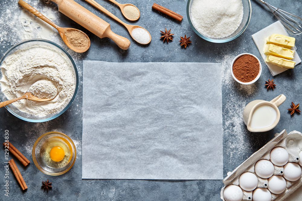 Dough preparation recipe homemade bread, pizza or pie ingridients, food flat lay on kitchen table background. Working with butter, milk, yeast, flour, eggs, sugar pastry or bakery cooking. Text space