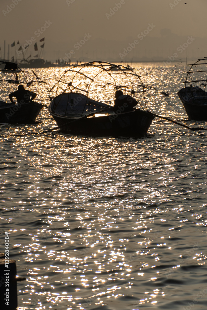 Silhouetted Boats at Sunset – A Serene Riverside Scene