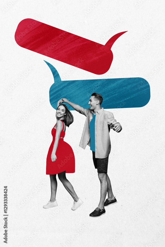 Artwork photo vertical collage of two happy girl guy dance bubble communication icon phrase speech talk social media dialogue