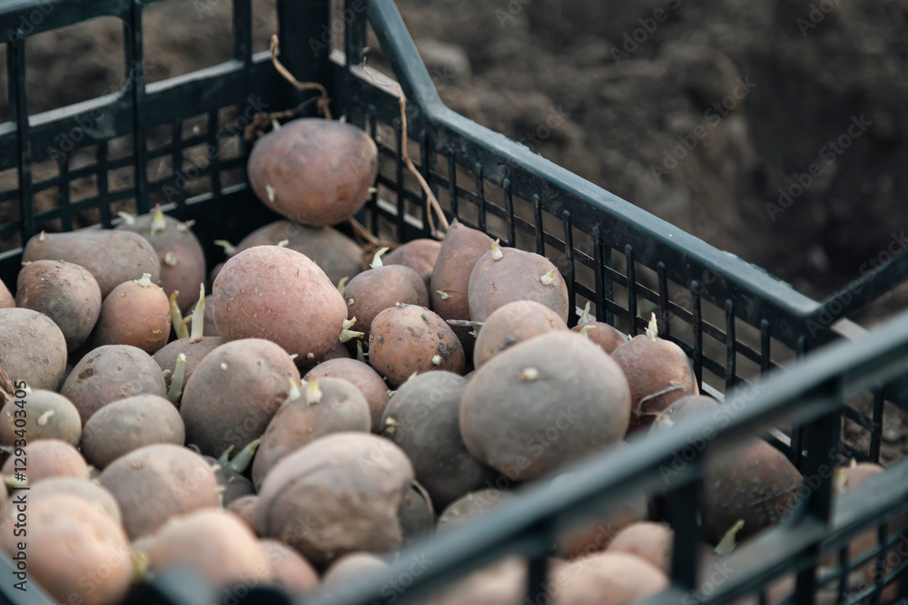 Potatoes for planting with sprouted shoots in a plastic box, close up.
