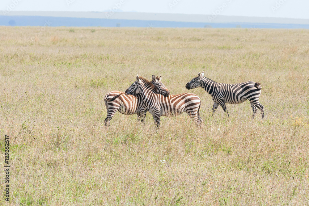 Three Burchell’s Zebras flirt on savanna plain. Serengeti National Park, Great Rift Valley, Tanzania, Africa.