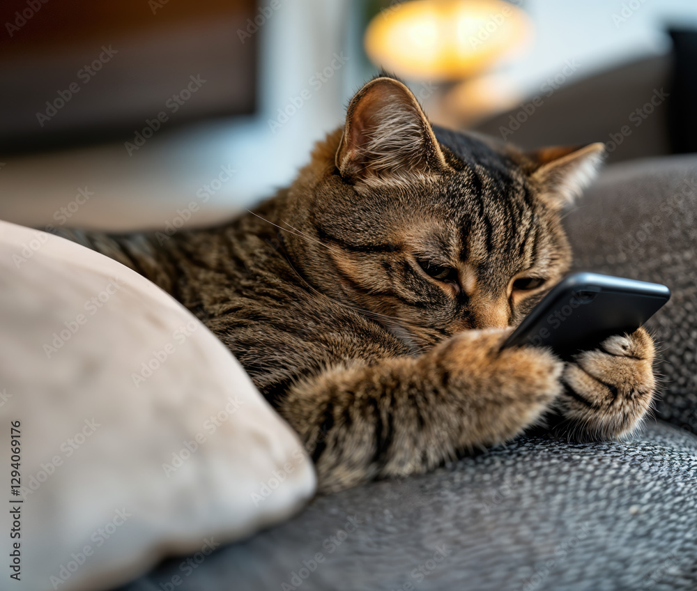 Chat tigré avec smartphone allongé sur un canapé