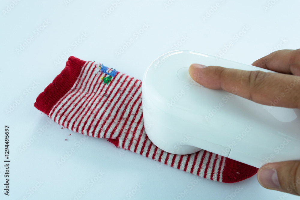 Female hand holding pellet cleaner, cleaning baby sock. Garment care concept.