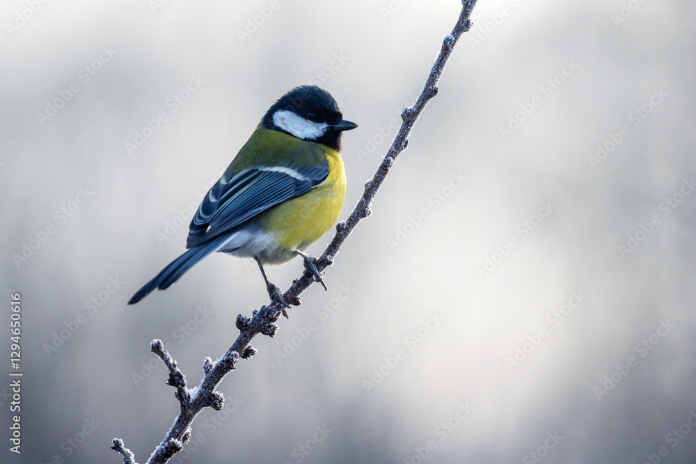 beautiful bird tit sitting on a frost covered branch in winter garden