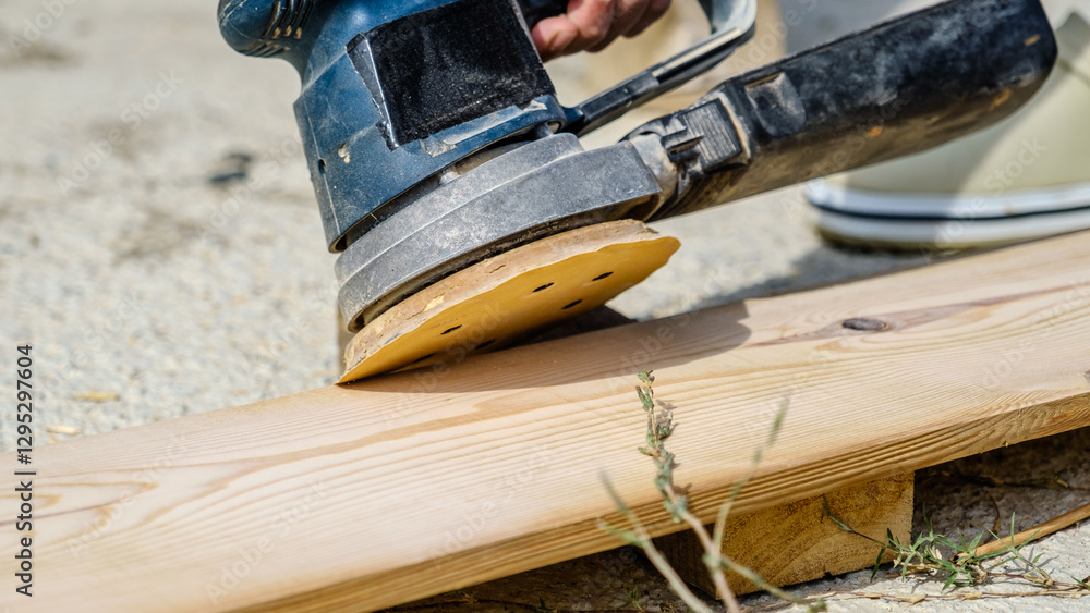 A middle-aged man sanding timber with a sander in the garden of his house on a summer day
