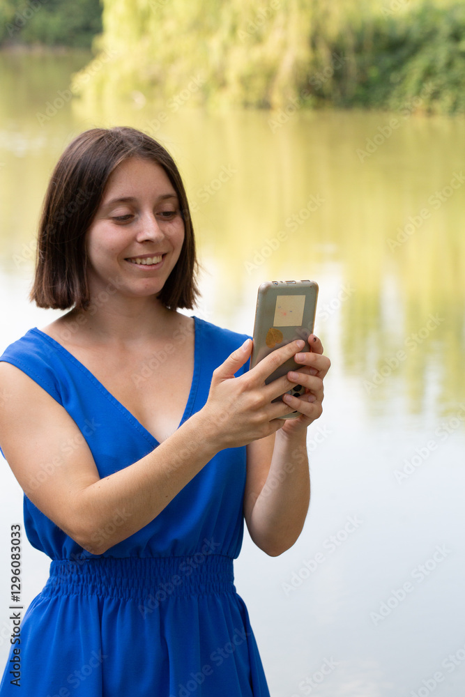 Young woman using smartphone near lake, enjoying mobile technology outdoors