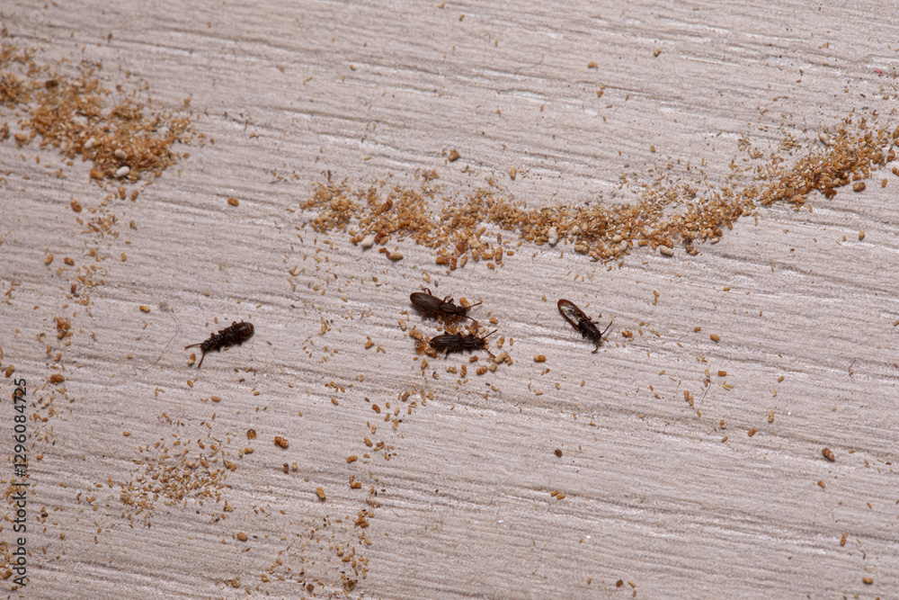 Biscuit beetles crawling on wooden surface leaving frass