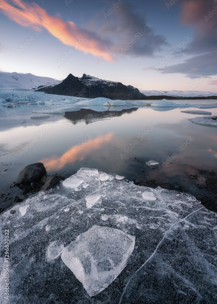Sunset at Fjallsarlon glacier lagoon on the edge of Vatnajökull National Park, South Iceland, Iceland, Europe