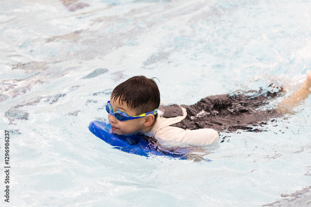 Boy is swimming in a pool with a blue float