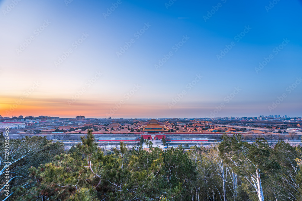 A panoramic view of the night scene of the Palace Museum in Beijing, China, a glorious historical site in the twilight