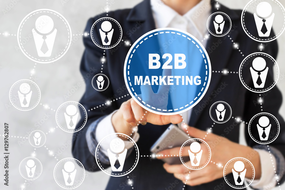 businesswoman presses B2B marketing button. Businessman touched icon business to business. Innovation concept presented by a consultant in business on webinar screen. Network, team, teamwork, internet