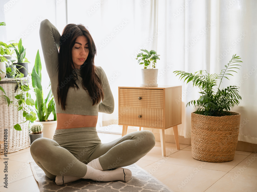 Beautiful woman practicing yoga and stretching at home sitting on floor in living room