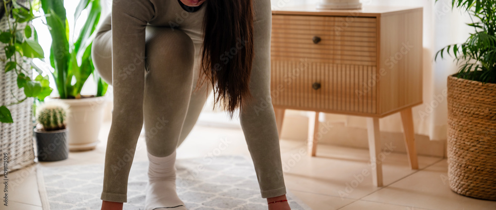Beautiful woman practicing yoga and stretching at home sitting on floor in living room