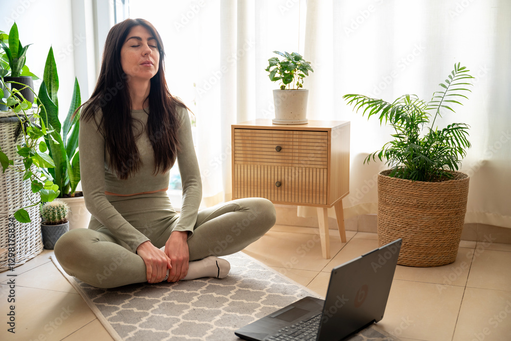 Beautiful woman making breathing exercises at home .Yoga and stretching