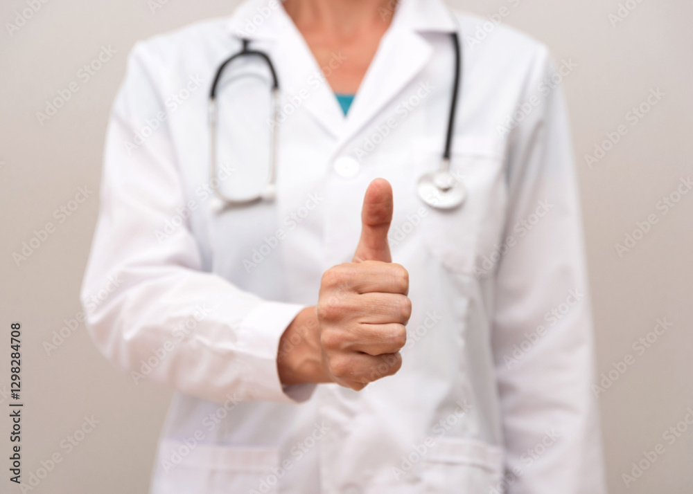 Close up of female Doctor showing thumbs up wearing lab coat and stethoscope, positive healthcare message