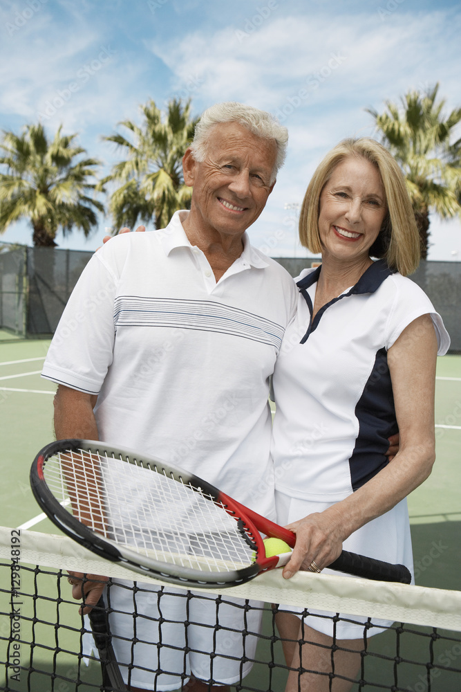 Portrait of happy senior couple in sportswear at tennis court