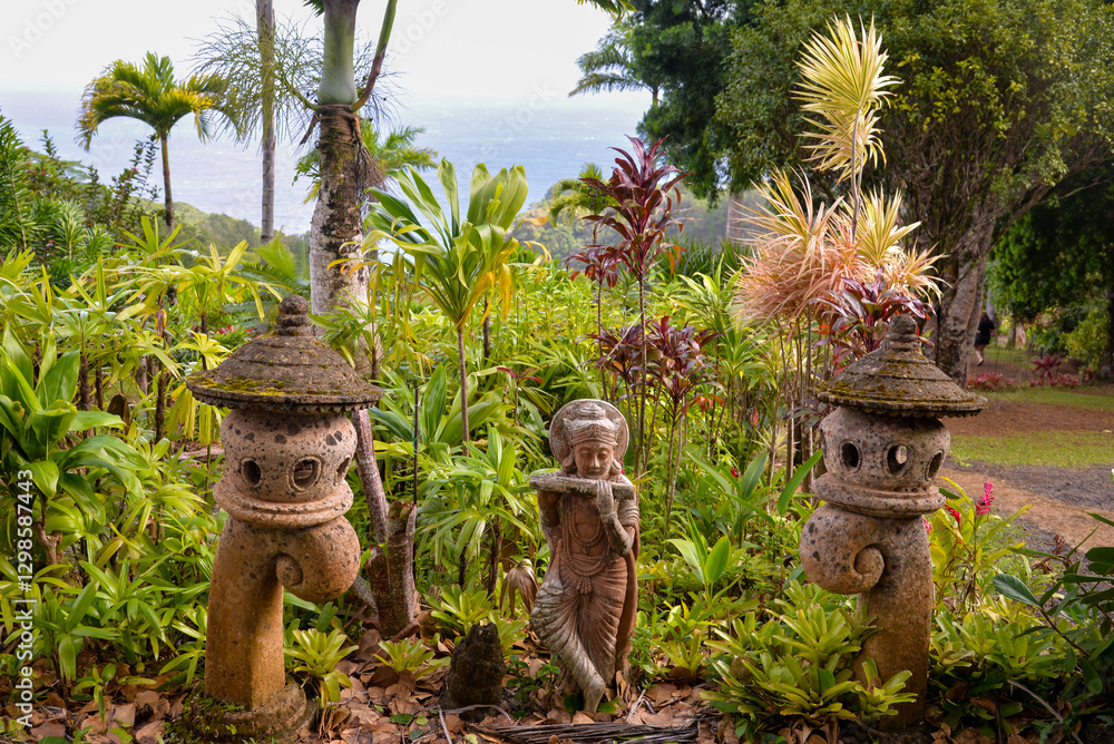 Maui, HI, USA – February 11, 2024: Beautiful sculptures and panoramic view from Garden of Eden Arboretum located close to the road to Hana