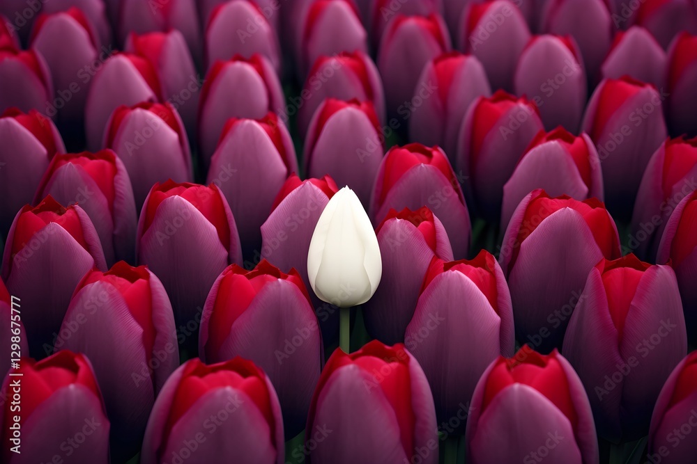 Unique white tulip among red tulips. Stand out concept. Individuality and diversity in nature. Women's day, Mother's day, Valentine's day symbol. Floral background.