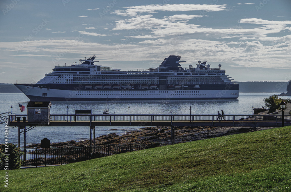 Modern Family cruiseship cruise ship liner Summit or Millennium anchored in Bar Harbor, Maine archipelago with islands, coast line and tender boats on sunny day New England Indian Summer cruising