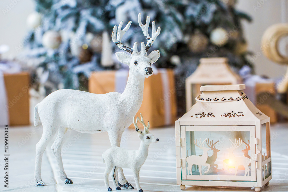 closeup christmas figurine of deer and fawn standing near nightlight on the background of the Christmas tree
