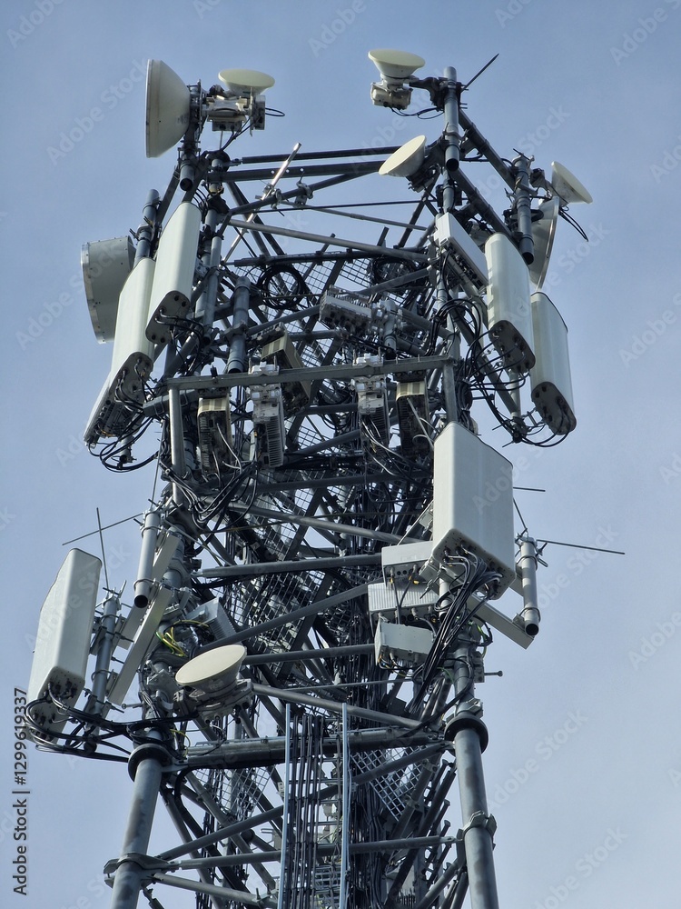 Wieża Telekomunikacyjna z Antenami i Sprzętem na Metalowej Konstrukcji
