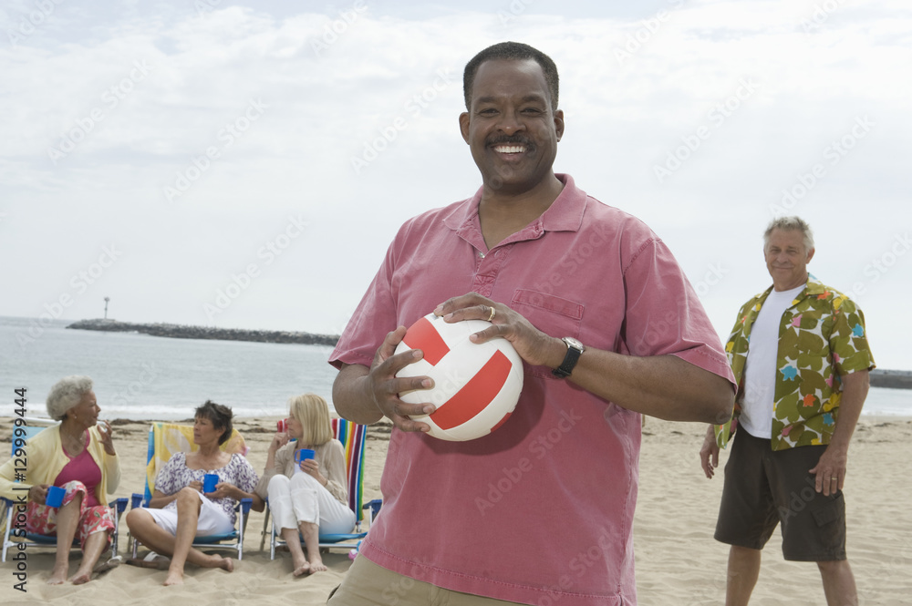 Portrait of an African American man holding volley ball with friends grouped behind at beach