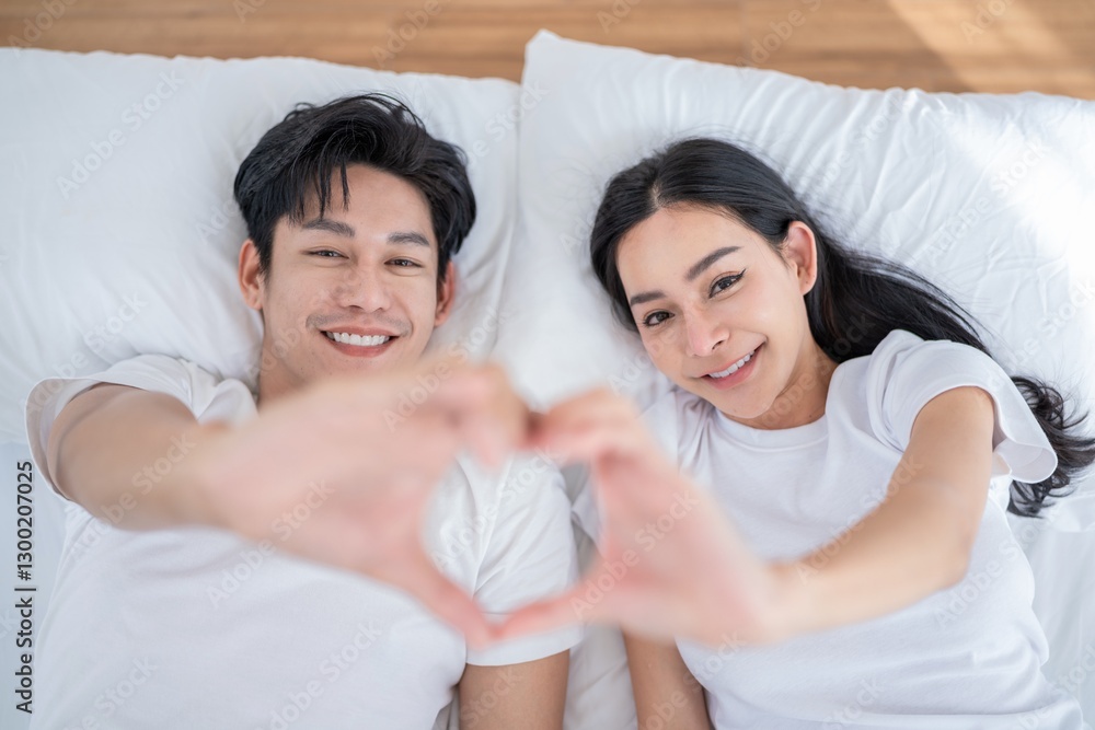 Young couple sharing love and happiness while making a heart shape with hands in their cozy bedroom