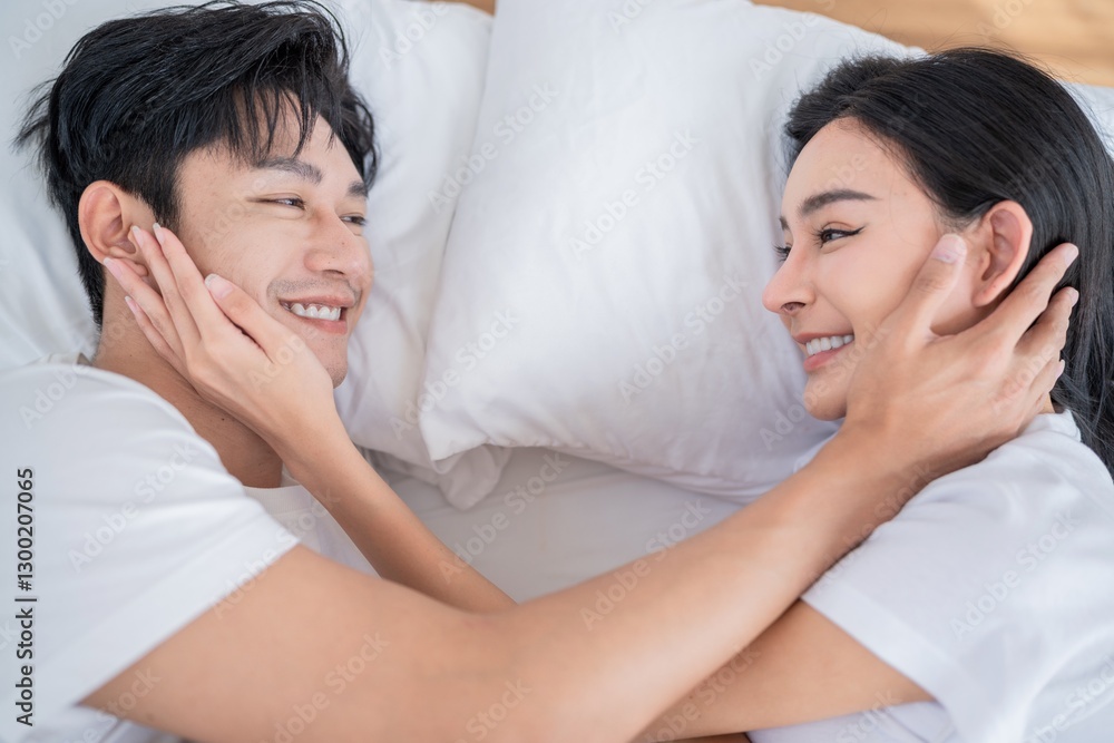 Couple shares a joyful moment in bed, enjoying each other's company in a cozy morning setting