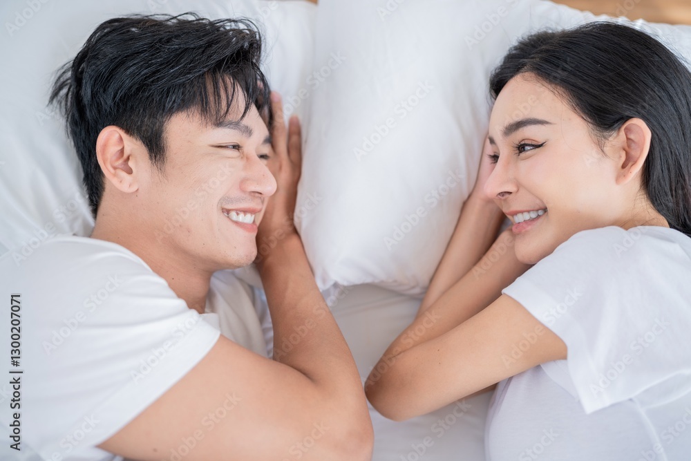 Couple enjoying a moment of joy and connection while lying together in a bright bedroom on a peaceful morning