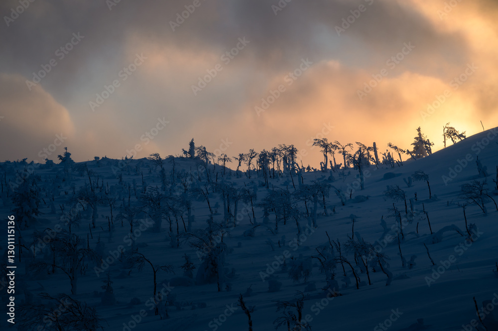 Wonderful winter snow covered scene at dusk over Gaspesie peaks, Quebec, Canada