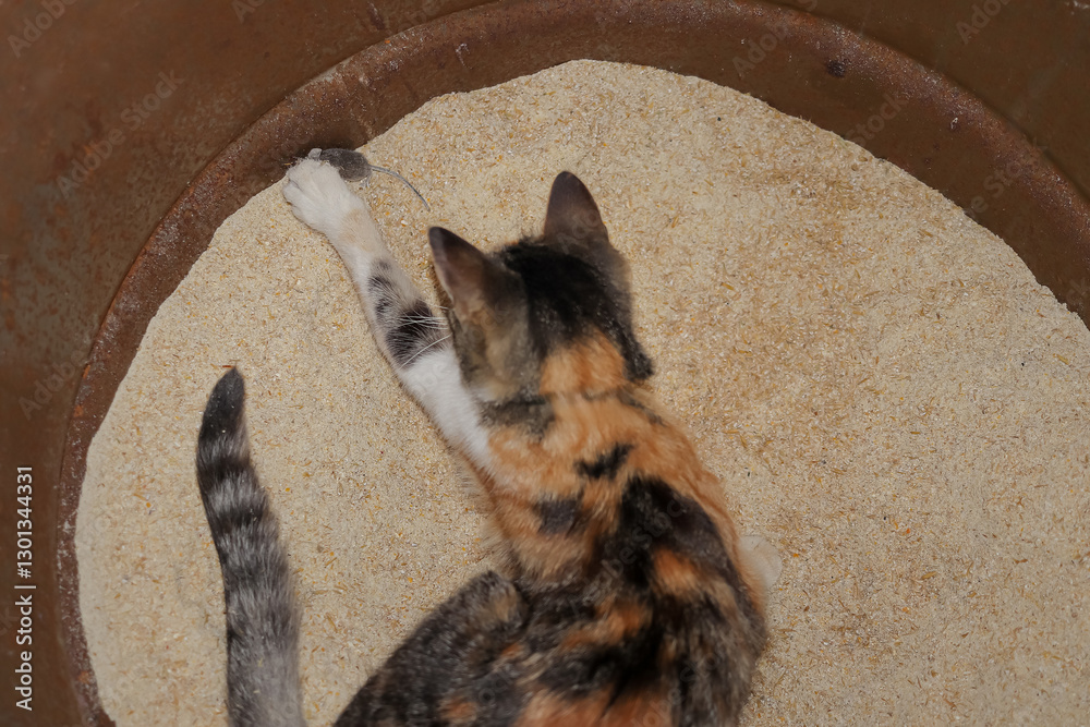 a tricolor cat caught a mouse in a barrel of ground grain with its paw. cat hunting for mice. mouse invasion, pest control, crop damage